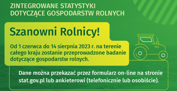 Szanowni Rolnicy! Od dnia 1 czerwca do 14 sierpnia 2023 r. na terenie całego kraju zostanie przeprowadzone badanie dotyczące gospodarstw rolnych: Zintegrowane statystyki dotyczące gospodarstw rolnych, formularz R-SGR oraz Badanie pogłowia świń oraz produkcji żywca wieprzowego, formularz R-ZW-S. Celem badania jest dostarczenie informacji o gospodarstwach rolnych i związanych z nimi gospodarstwach domowych, koniecznej dla realizacji krajowej i regionalnej […]
