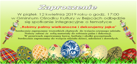 W czwartek 30 marca 2023 roku o godz. 17:00 w Gminnym Ośrodku Kultury w Bejscach odbędzie się spotkanie integracyjne o tematyce „Robimy palmy wielkanocne”. Podczas warsztatów będzie również wykonywana palma wielkanocna do kościoła. Serdecznie zapraszamy wszystkich chętnych do wzięcia czynnego udziału. Należy zabrać ze sobą materiały do robienia palm i dekoracji. W przerwach zapewniamy kawę, […]